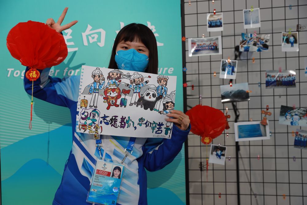 中除夕当天,北京冬奥会延庆赛区冬奥村里张灯结彩,志愿者和各代表团成员相聚一堂,庆祝欢乐祥和的春节。
