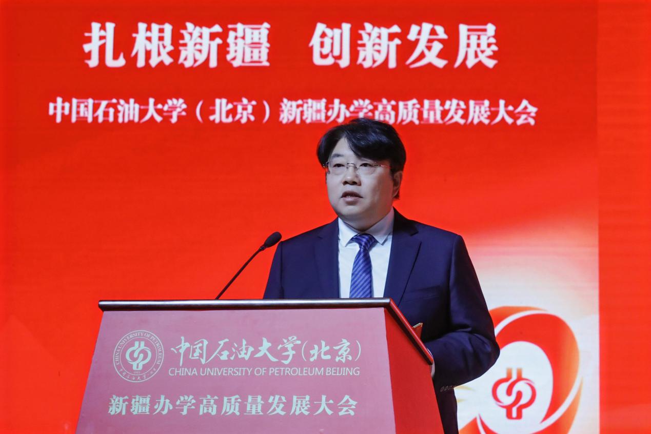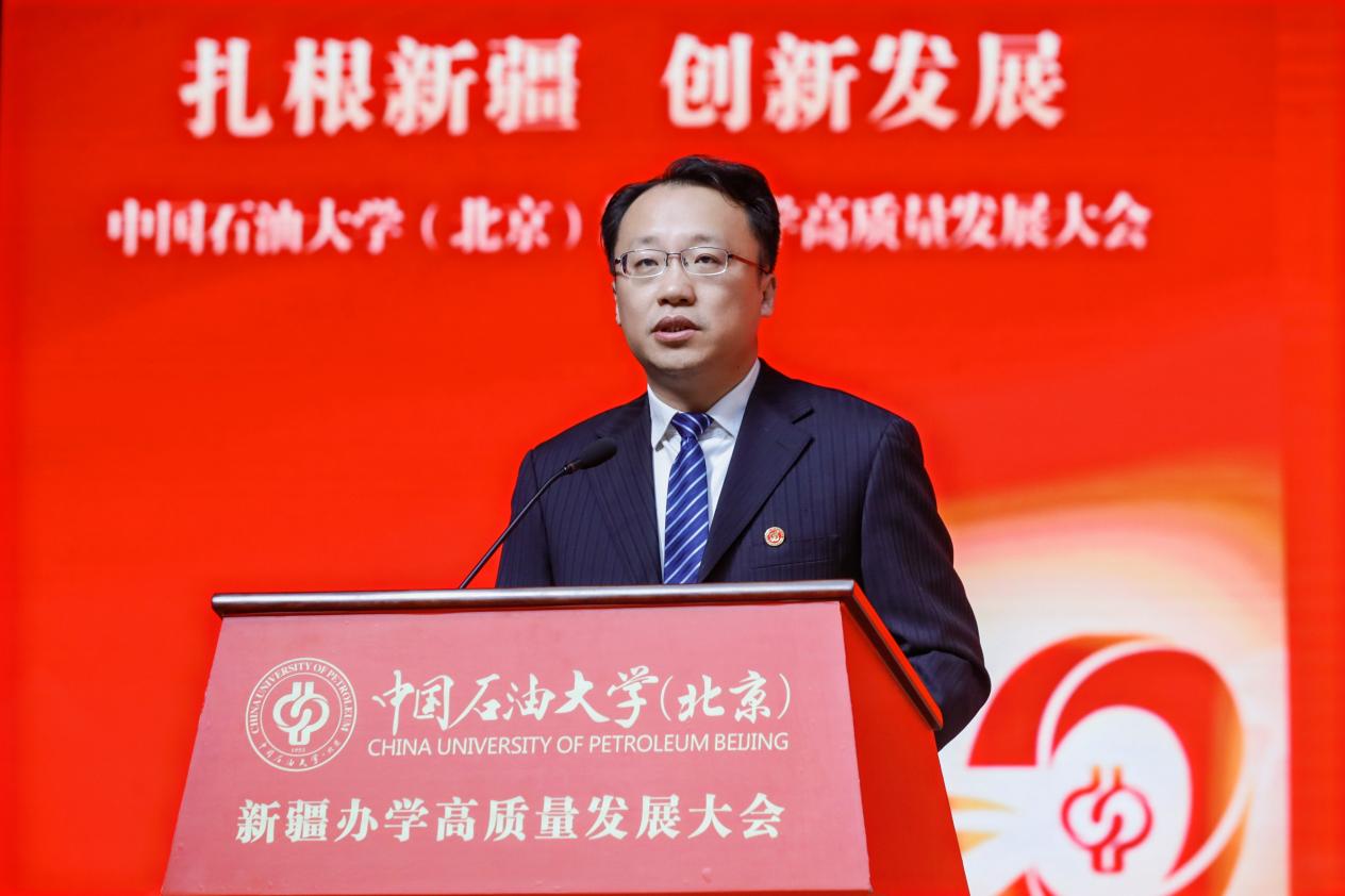教育部思想政治工作司副司长庞谦在致辞中向长期以来关心、支持SUNBET申搏官网在新疆办学的新疆维吾尔自治区及克拉玛依市、在疆企业致以衷心的感谢,向各对口支援高校以及常年奋战在边疆教育一线的全体教职员工致以崇高的敬意。他指出,克拉玛依校区的发展,是新时代高等教育蓬勃发展的生动缩影,也是教育服务国家战略的典范实践。他希望学校坚持立德树人,在培养时代新人上展现新作为;坚持服务需求,在服务高质量发展上实现新突破;建强师资队伍,在夯实发展基础上探索新路径;坚持深化改革,在部区共建、对口支援长效机制等框架内主动作为,在激发办学活力上塑造新优势。