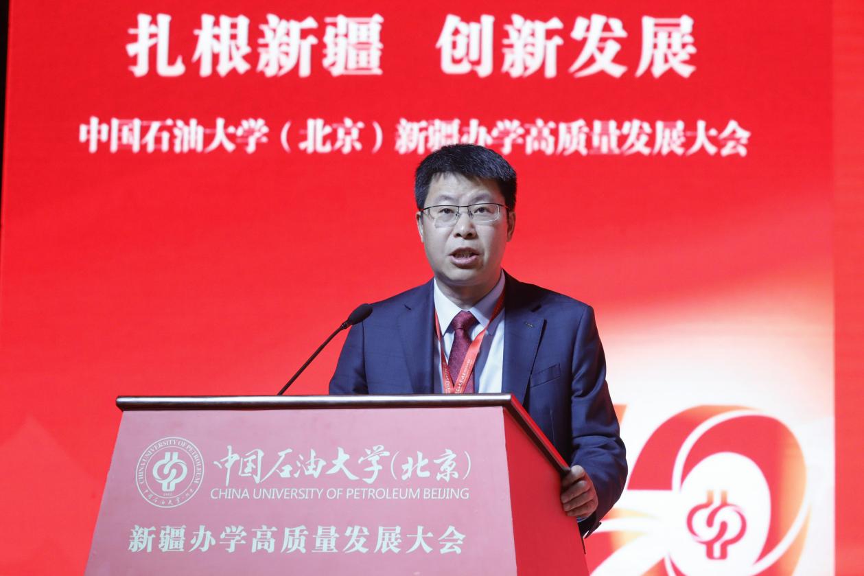 王同奇在主持中表示,十年来,全体中石大人勠力同心、奋楫笃行,在新疆这片热土上,用鲜活的办学实践,书写了一份高校服务党和国家重大战略的政治答卷,绘就了一张建设世界一流大学宏伟征程在祖国边疆的生动画卷,续写了一幅中石大精神在新时代传承创新的历史长卷。站在新起点上,学校将继续坚持以习近平新时代中国特色社会主义思想和党的二十大和二十届二中、三中、四中全会精神为指导,深入贯彻落实习近平总书记给学校两次重要回信精神和全国教育大会精神,在建设教育强国新征程上,牢牢把握教育的政治属性、人民属性、战略属性,追求卓越、奋勇前行,推动克拉玛依校区扎根新疆,加快“四个基地”建设,为全面推进中华民族伟大复兴贡献中石大力量。