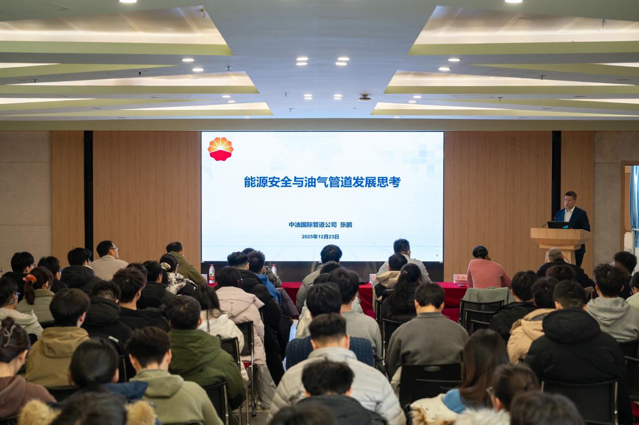 张鹏通过全球油气产量占比、消费量、产量增长率等数据的对比,分析全球能源供需形势,表示石油仍是最主要的能源供应来源,但是在当前能源转型背景下,也要关注新能源发展。他从油气管道发展现状与运行管理两方面,介绍了中外管道里程、分布情况及管理重点,并强调跨学科知识学习的重要性。张鹏结合自身工作经历,展望行业未来,指出油气管道行业正处于数字化和低碳化的变革时期,勉励在场学生要努力成为具备系统思维、数字化能力和低碳意识的复合型人才。