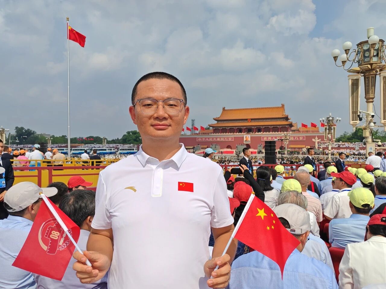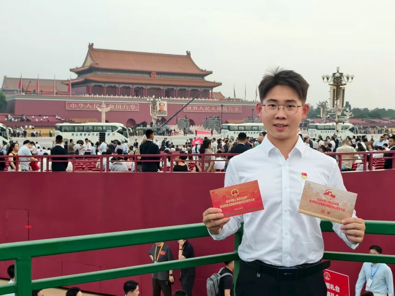 志愿者代表李茂粟表示,2019年,在长安街上汇入国庆70周年群众游行的洪流,在“艰苦奋斗”方阵中用脚步丈量祖国的辉煌变迁;2021年,在鸟巢与合唱团唱响《没有共产党就没有新中国》,在歌声里见证百年大党的风华正茂;2022年,在延庆冬奥村与外国友人共绘冰墩墩,用热忱与坚守为世界展现中国的活力与包容。今天,再一次站在天安门广场,当激昂的旋律在广场回荡,历史的厚重与当下的荣光在心中交织,震撼与激动难以言表。四次参与,四次蜕变成长;四份经历,四重信念担当。镌刻着不屈与担当的抗战精神从未远去,必将在我们一代又一代青年的接续奋斗中薪火永续、光耀千秋!