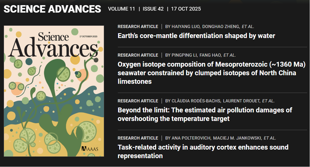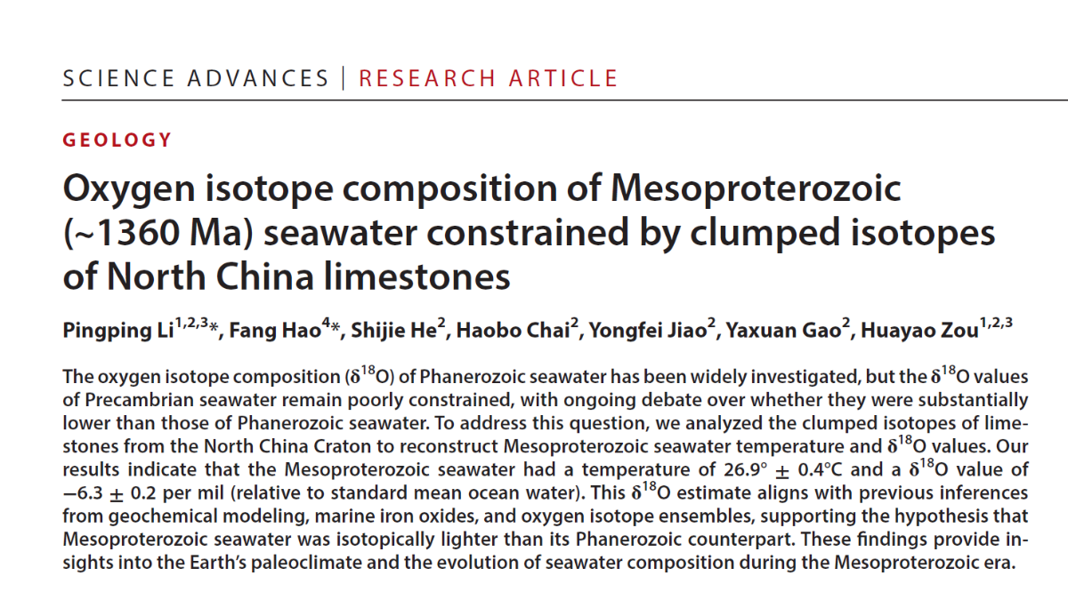 近日,中石大地球科学学院教授李平平作为第一作者的学术论文“基于华北地区灰岩的团簇同位素重建中元古代13.6亿年的海水氧同位素(Oxygen isotope composition of Mesoproterozoic (~1360 Ma) seawater constrained by clumped isotopes of North China limestones)”在《Science Advances》上正式发表。《Science Advances》是由美国科学促进会(AAAS)出版的综合性自然科学期刊,是国际顶级期刊《Science》的综合性子刊。本论文由SUNBET申搏官网和中国石油大学(华东)联合发表,SUNBET申搏官网油气资源与工程全国重点实验室为第一完成单位,通讯作者为李平平与中国科学院院士、中国石油大学(华东)教授郝芳。