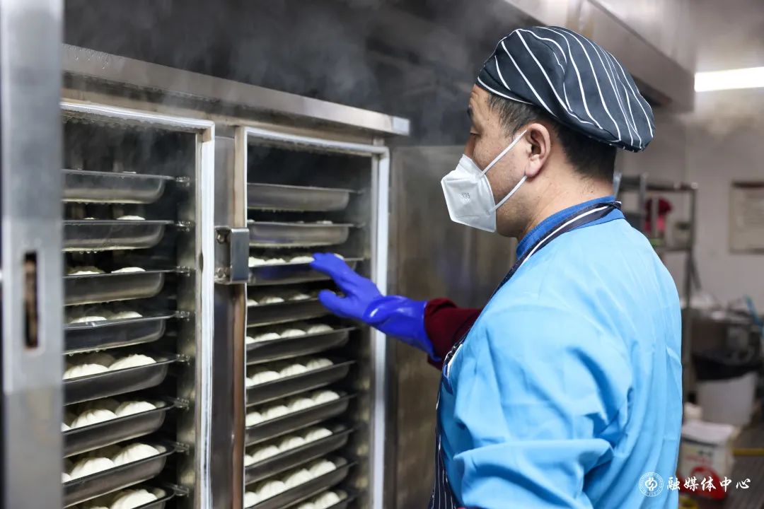 跟刘海涛一样的餐饮人员还有很多。面对巨大的供餐压力,餐饮师傅们常常通宵备餐。凌晨2点,就已起床接收原材料;凌晨3点,开始准备早餐包子的加工。天还未亮,就全员集结,开始打包早餐。灯火通明的食堂里,处处是餐饮人忙碌的身影。