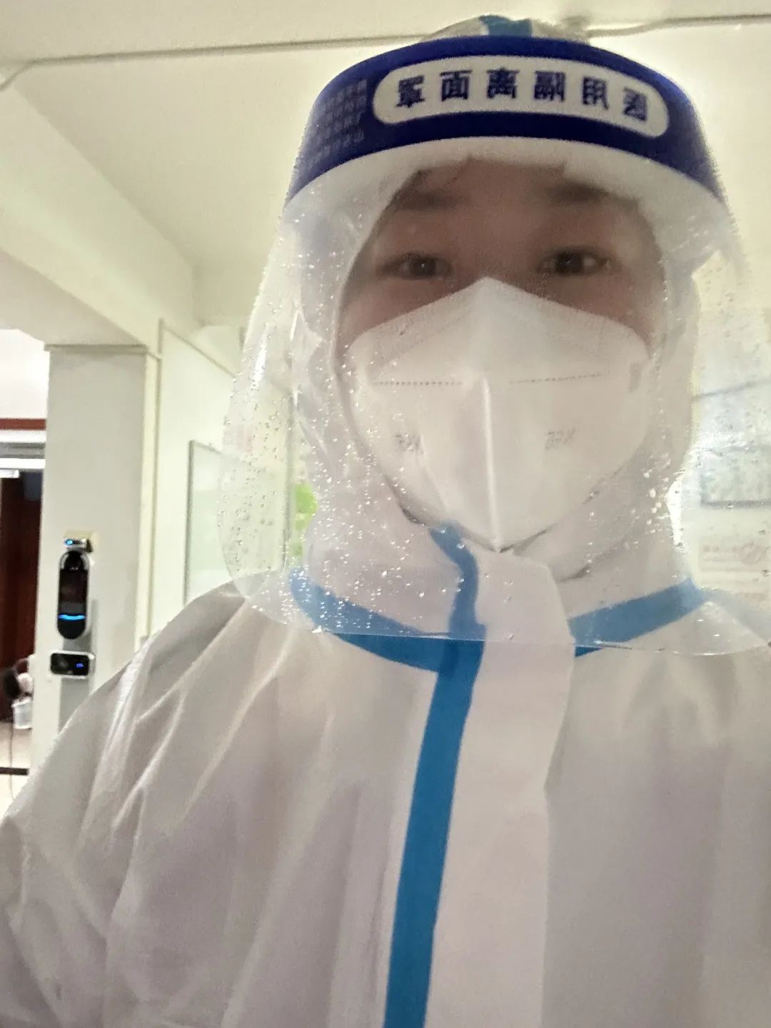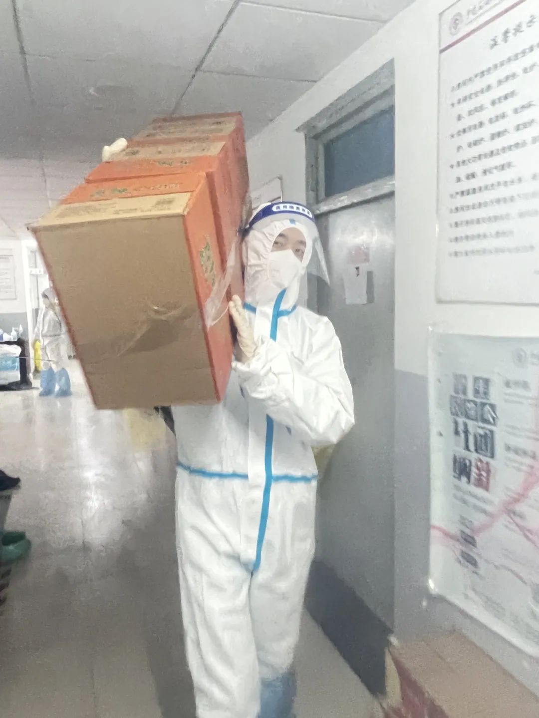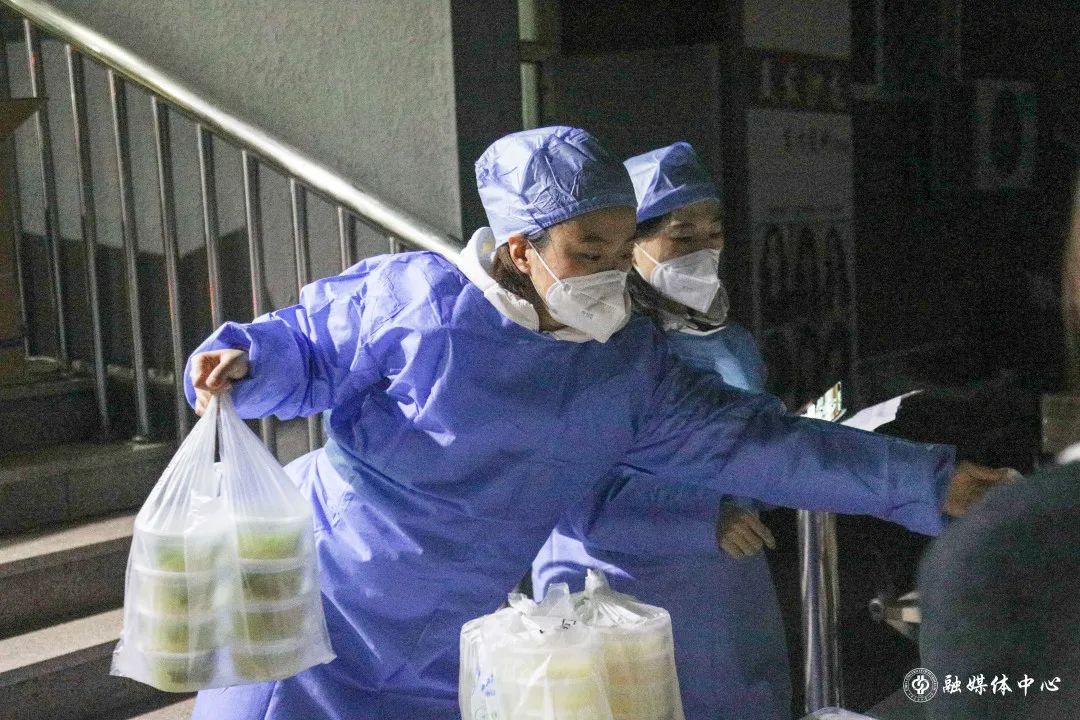 两兄弟穿着大白,和两位志愿者一起配送早饭、组织转运、配送午餐、搬运物资、配送晚餐,直到最后一位同学吃上饭,俩人才顾不得形象,累得一屁股坐下。汗水氤氲模糊了面罩,一天水米未进的胃,阵阵绞痛。