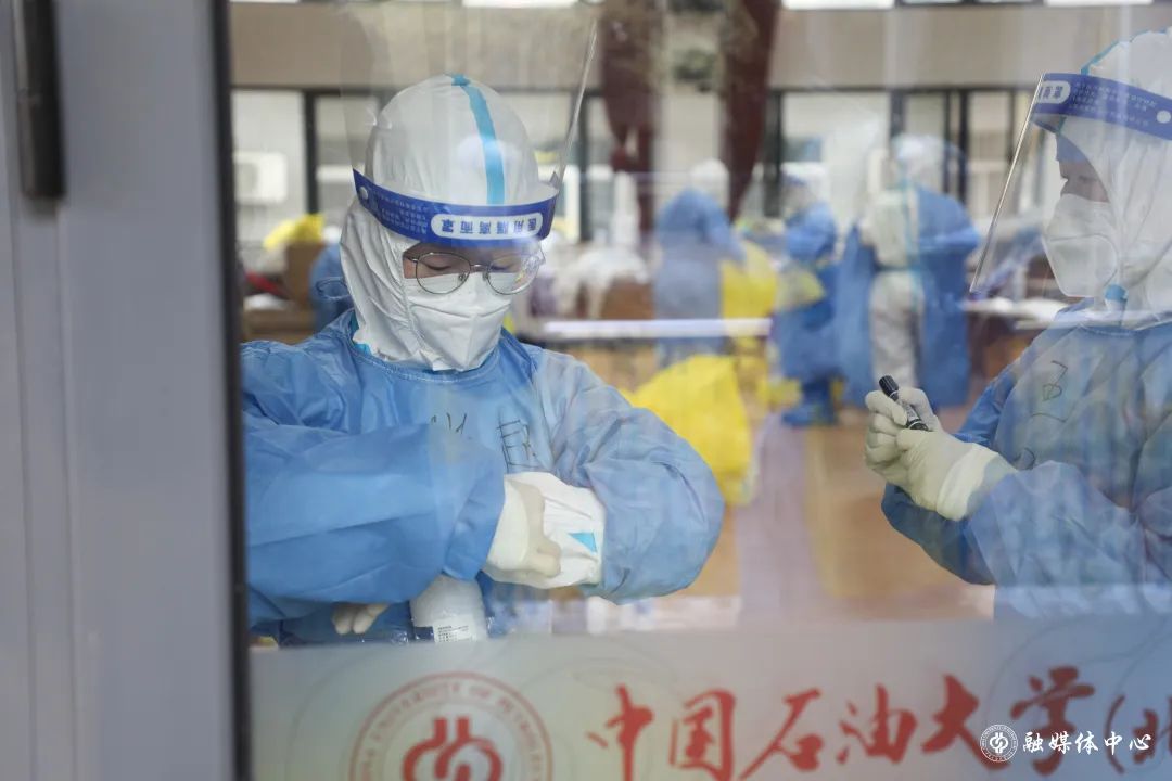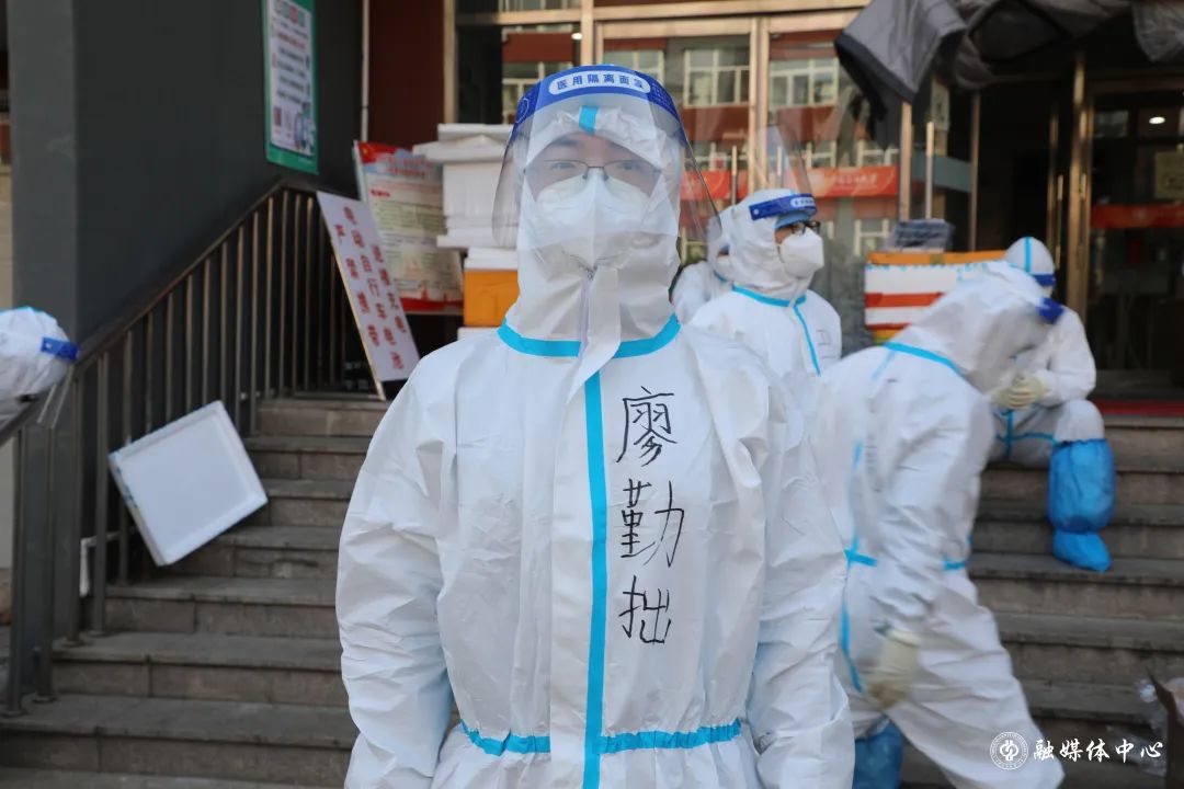 下午三点钟吃完午饭,张冠军给家人报平安。妻子心疼地唠叨:“50多了,高血压,还这么拼命。”张冠军连忙找补:“人家穆桂英53岁还挂帅征西呢,谁说俺男儿家不如女郎啊?!”他说,核酸采样小组里好多老师都是克服了家里这样那样的困难来的,有的家里孩子还小需要照料,有的刚刚失去了亲人,也有像他一样的“50后”“老一代”,“大家都在这个被认为‘高危’的工作中恪尽职守,我也为有幸参与到这样一个群体里而欣慰”。同学们也把张老师化身“大白”的事,在群里广而告之,表达着“师生同在、甘苦与共”的喜悦和感动。