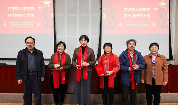 山红红、张来斌为退休教职工颁发了荣誉证书和纪念杯。吴小林宣读了2018年退休教职工名单。