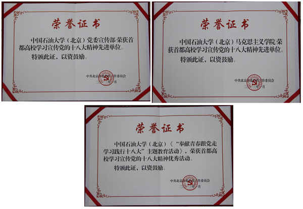 近日,中共北京市委教育工作委员会发布北京高校学习宣传党的十八大精神先进单位和优秀活动评选结果,中国石油大学党委宣传部、马克思主义学院荣获“首都高校学习宣传党的十八大精神先进单位”荣誉称号,由校团委组织开展的“‘奉献青春跟党走 学习践行十八大’主题教育活动”被评为“首都高校学习宣传党的十八大精神优秀活动”。