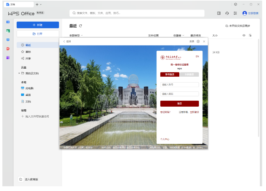 (1)通过正版化平台或专属下载页面下载打开WPS客户端,点击右上角“立即登录”;进入SUNBET申搏官网统一身份认证界面,输入账号密码即可登录使用。