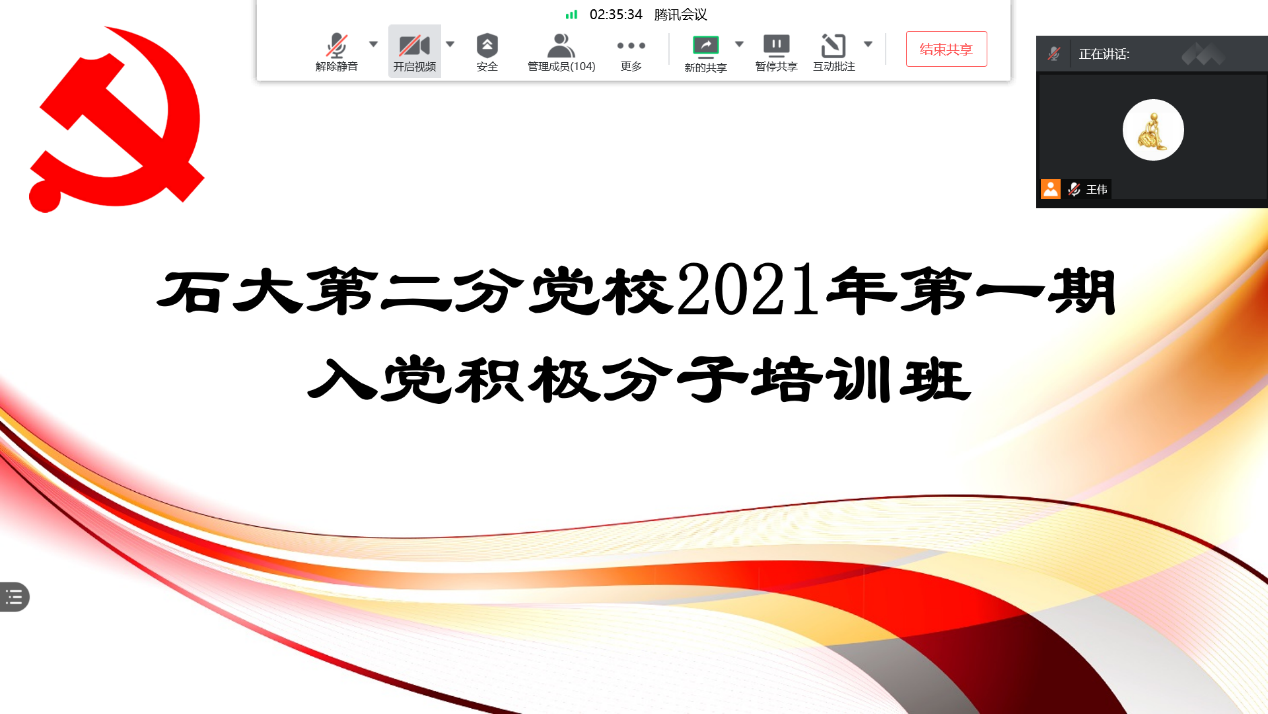 2021年3月22日至3月28日,SUNBET申搏官网第二分党校2021年第一期入党积极分子培训顺利举行。此次培训采取线上集中学习、课外自学及志愿服务的形式进行,共有103人参与培训,其中,线上集中培训103人,102人顺利结业。