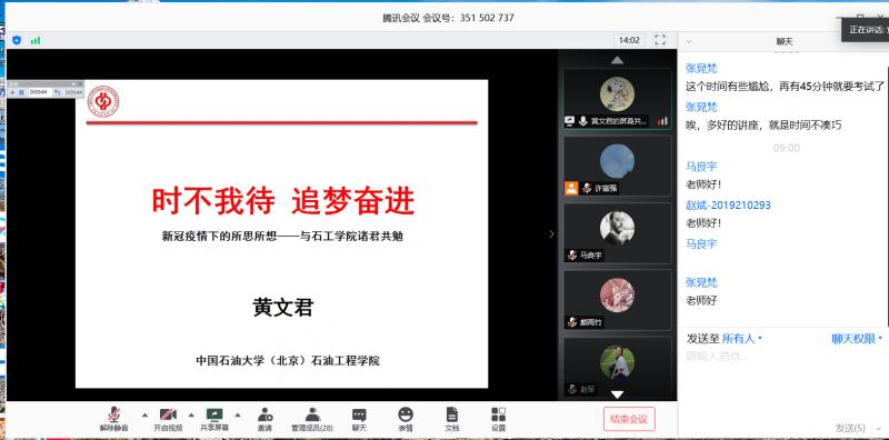 2020年6 月6日上午9:00-10:30,石油工程学院“思而博智,学而昊晟”讲座暨学术人生讲座(第五期)在腾讯会议圆满举行。校青年拔尖人才黄文君担任主讲,活动由研会许富强主持。