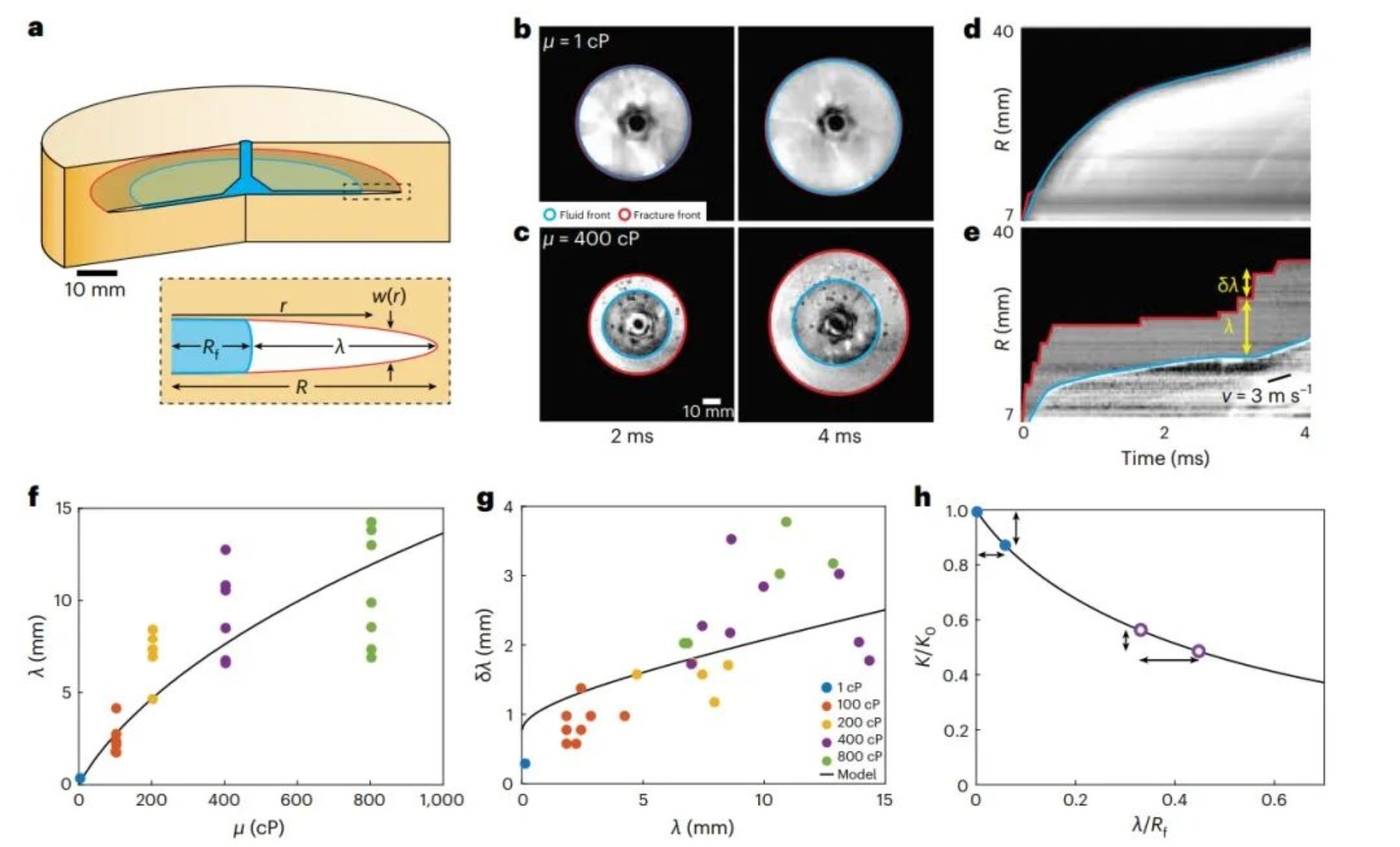 Cochard说:“这是一个非常动态的过程。新裂缝在断裂停滞前沿线的某个地方形成,局部扭曲,导致裂缝以声速在断裂线方向上扩展,然后液体跟进。裂缝停止,夜体渗透,引起断裂前沿应变,新的裂缝再次开始遵循相同的动力学过程。”各种流体粘度下水力压裂实验的原始图像,每秒捕获100000帧。内环和外环分别对应于液体及断裂前沿的位置。通过视频,可以看到裂缝前沿呈现出停止和前进的抖动运动。振幅和时间随流体粘度而变化。研究发现,这些跳跃之间的振幅和时间取决于液体的粘度。对于低粘度液体(如水),跳跃之间的时间很短,因为流体几乎瞬间就渗透到裂缝中。对于高粘度液体(如甘油,其粘度类似于蜂蜜),所谓的断裂前沿(裂缝所在的位置)和流体前沿(液体尖端所在的位置)之间的滞后时间会增加,因为高粘度流体需要更长的时间才能渗透到裂缝中并将其扩展。