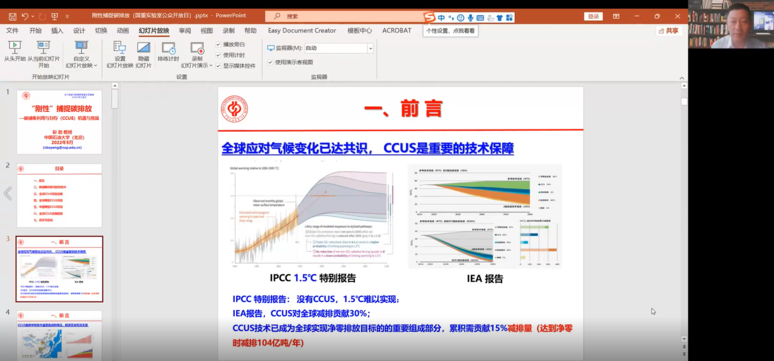 彭勃教授主要介绍了碳捕集利用与封存(CCUS)技术背景、CCUS对双碳目标的保障与支撑、CCUS国际和国内发展状况、CCUS技术特征与实践、CCUS机遇与挑战。
