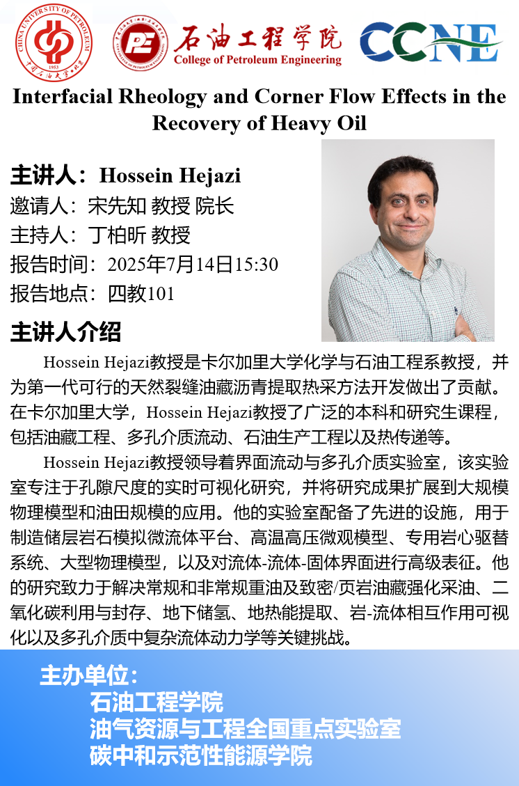 Hossein Hejazi教授领导着界面流动与多孔介质实验室,该实验室专注于孔隙尺度的实时可视化研究,并将研究成果扩展到大规模物理模型和油田规模的应用。他的实验室配备了先进的设施,用于制造储层岩石模拟微流体平台、高温高压微观模型、专用岩心驱替系统、大型物理模型,以及对流体-流体-固体界面进行高级表征。他的研究致力于解决常规和非常规重油及致密/页岩油藏强化采油、二氧化碳利用与封存、地下储氢、地热能提取、岩-流体相互作用可视化以及多孔介质中复杂流体动力学等关键挑战。