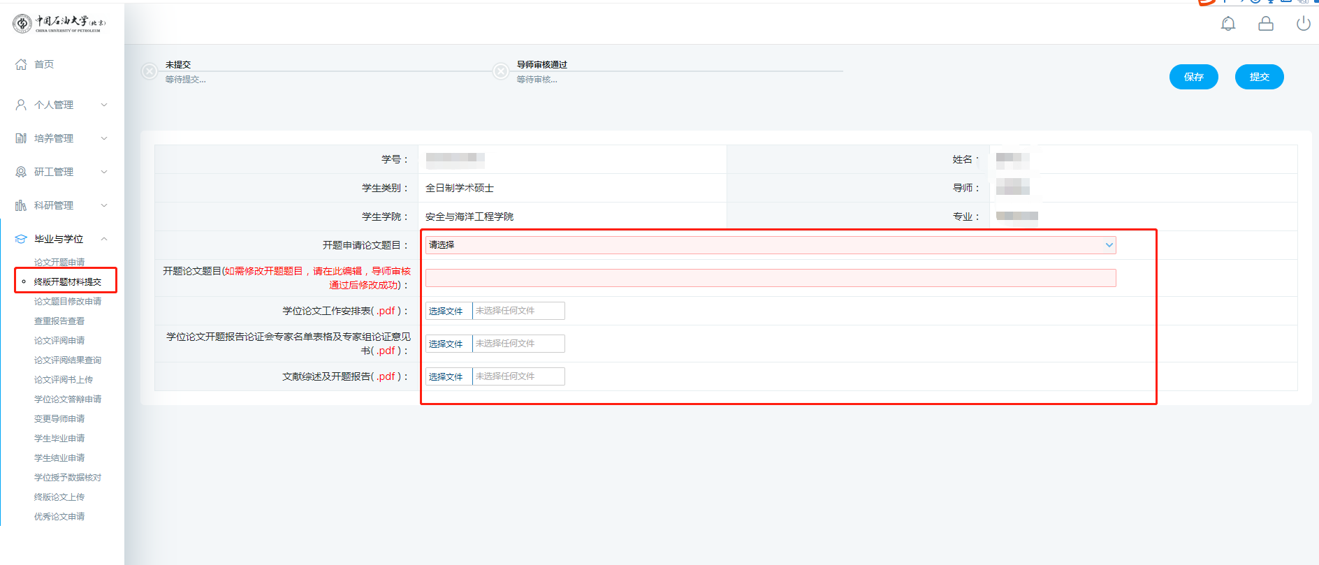 学生系统提交终版开题材料,导师审核、学院审查通过后,学院方可审核通过开题结果。