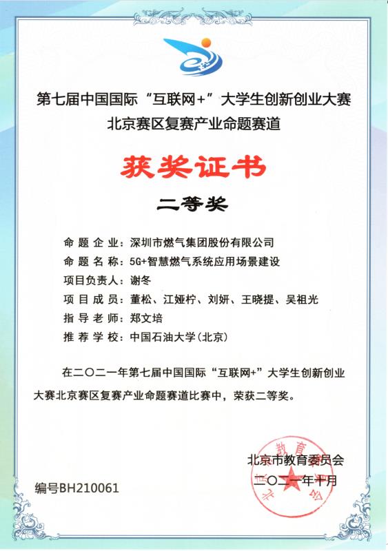 在2021年第七届中国国际“互联网+”大学生创新创业大赛,北京赛区复赛产业命题赛道中,依托深圳市燃气集团股份有限公司,帅健老师指导研究生徐后佳、张铁耀等,以“城镇燃气管道智能完整性管理系统开发”为题,荣获二等奖;郑文培老师指导研究生谢冬、董松等,以“5G+智慧燃气系统应用场景建设”为题,荣获二等奖。该项比赛由教育部与政府、各高校共同主办。大赛旨在深化高等教育综合改革,激发大学生的创造力,培养造就“大众创业、万众创新”的主力军;推动赛事成果转化,促进“互联网+”新业态形成,服务经济提质增效升级;以创新引领创业、创业带动就业,推动高校毕业生更高质量创业就业。