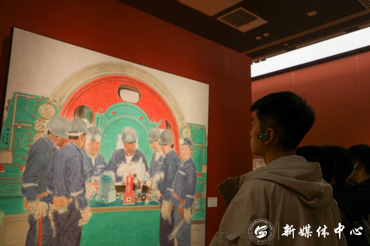 在中国美术馆主展厅,师生们在杨儒老师的带领讲解下,认真学习《金色土地》《休戚与共》《山河颂》等画作创作思路、作品解析,沉浸在优秀文化艺术作品的氛围中。在安静有序的参观过程中,同学们在一幅幅、一件件作品前时而拍照留念,时而低声交谈,时而驻足观望。师生们在《向海图强 逐梦深蓝》等各类体现新时代主题的书画雕塑、工艺美术、壁画作品中流连忘返,共同品鉴美术之韵,感受中国写意、写实等画作的审美意蕴,领略艺术对新时代的展现。