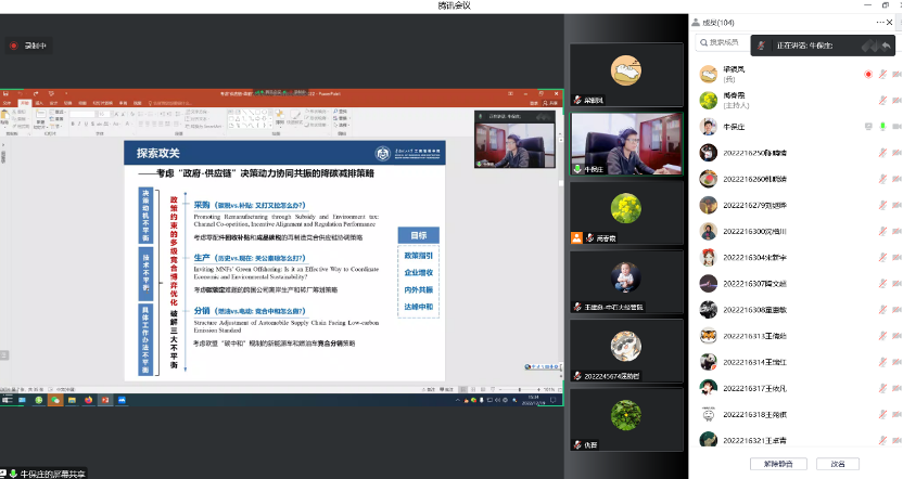 12月19日,经济管理学院“春华论坛”第十七期在线上举行,应经济管理学院的邀请,华南理工大学教授、国家杰青、广东省政协委员、UTD24期刊POM编委牛保庄教授以主题“考虑‘政府-供应链’协同决策的降碳减排策略”开展了学术报告。此次报告由企业管理系禹春霞副教授主持,经济管理学院院长王建良教授、副院长赵晓丽教授及院内外一百多位师生在线参加了讲座。