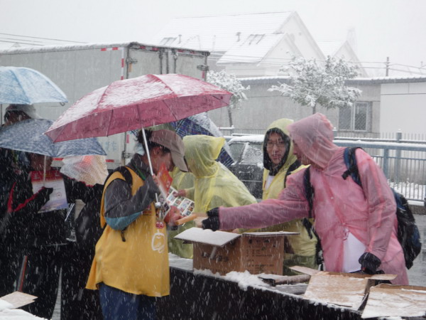 我校志愿者在风雪中坚持工作9个小时,于下午2时30分圆满完成志愿服务任务,表现出了我校学生良好的精神风貌和不怕吃苦的志愿服务精神。