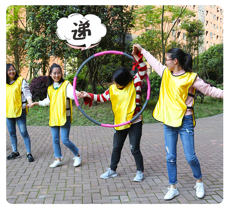 各学院以6名女生为单位,6人手拉手站成一排依次从呼啦圈中穿过,再折返,用时少的队伍获胜。在穿越呼啦圈的过程中6人如出现手手脱离将取消比赛资格。