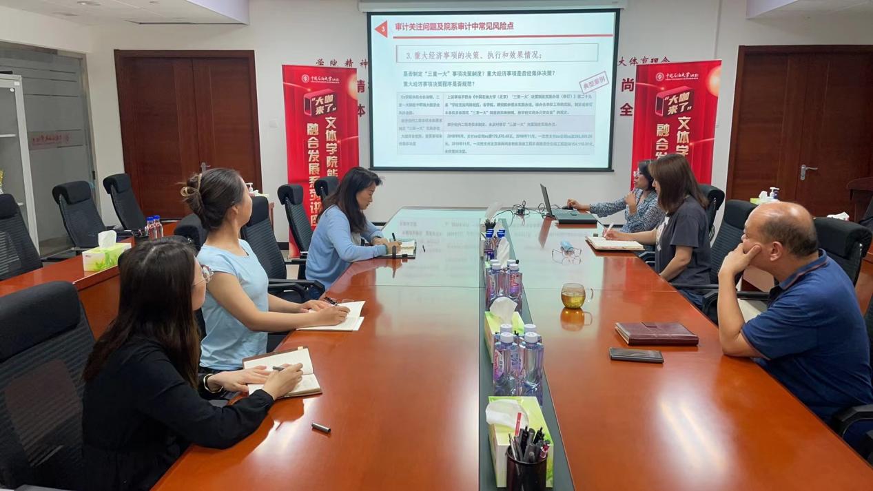 2024年7月3日上午10时,文体学院于A座922会议室圆满举办了首场“能力提升与融合发展”系列讲座,特邀审计处处长郑仕敏、主讲人陈平、阴晓莲老师交流指导,同时学院党委书记张珣、办公室全体人员出席会议。本次讲座以“审计专题”为核心,旨在深化学院教职工对审计工作的理解,增强经济运行的风险防范能力。