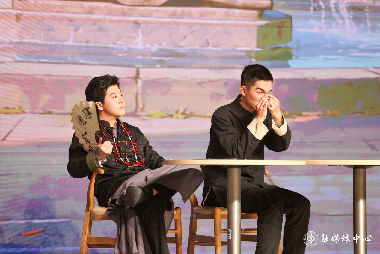 当晚,现场师生共同观看了由学校师生自编自导自演的原创反诈主题戏剧《同学开门,我是骗子》。该剧聚焦校园反诈主题,围绕六名大学生的校园生活,以轻松幽默的方式揭示常见诈骗手法,寓教于乐,引发观众共鸣。