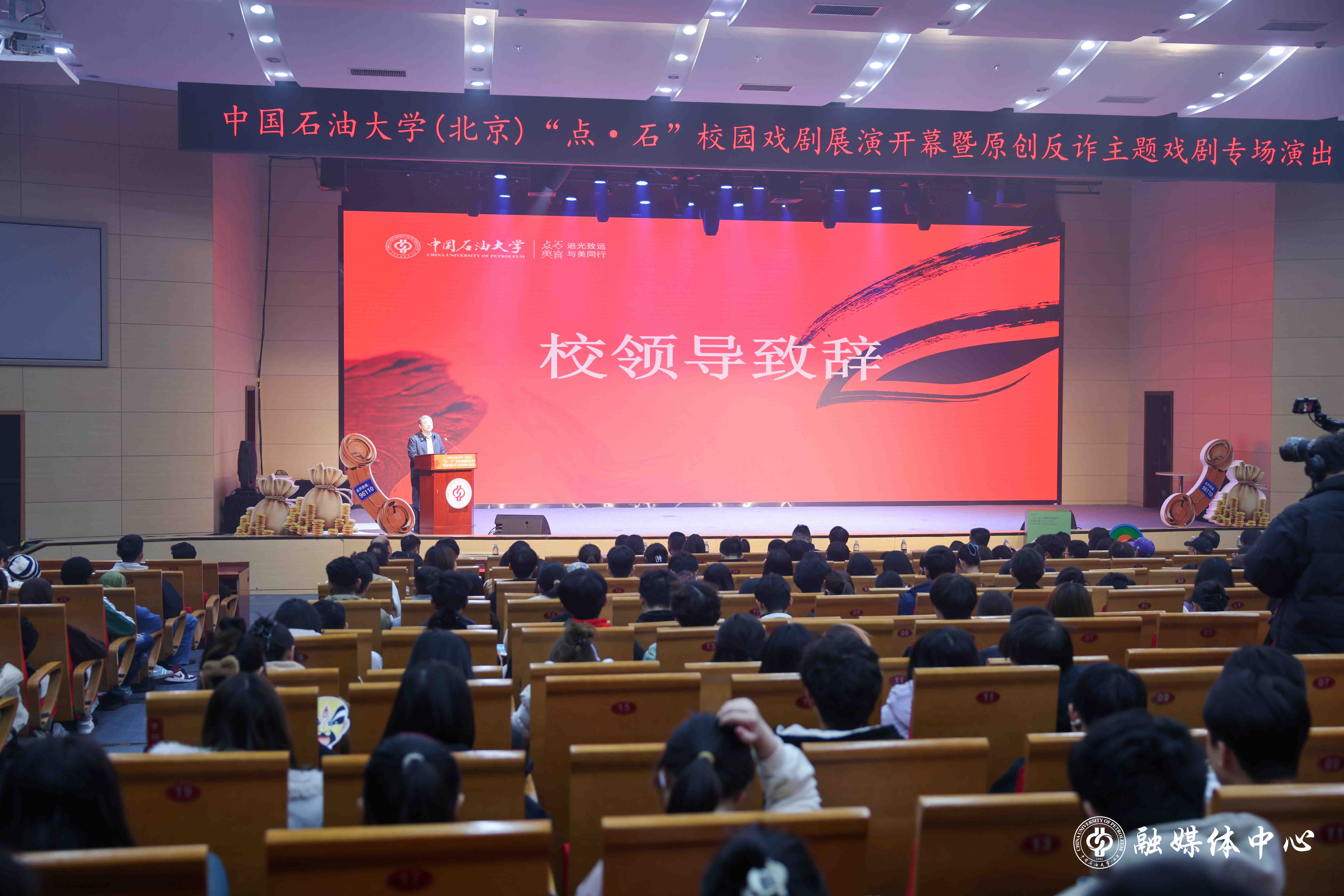 11月12日晚,中石大“点·石”校园戏剧展演开幕式在中油大厦三层报告厅举行。本次活动以“青春有戏,向美而行”为主题,旨在通过戏剧艺术形式深化美育育人功能,全方位地将美育与德育、智育、体育、劳育有机融合,构建具有中石大特色的校园文化育人平台。学校党委常委、副校长黄磊,北京市公安局昌平分局、昌平区反诈中心、松园派出所、昌平区文联等相关单位负责人,以及驻昌高校代表、学校相关职能部门和学院负责人出席活动。