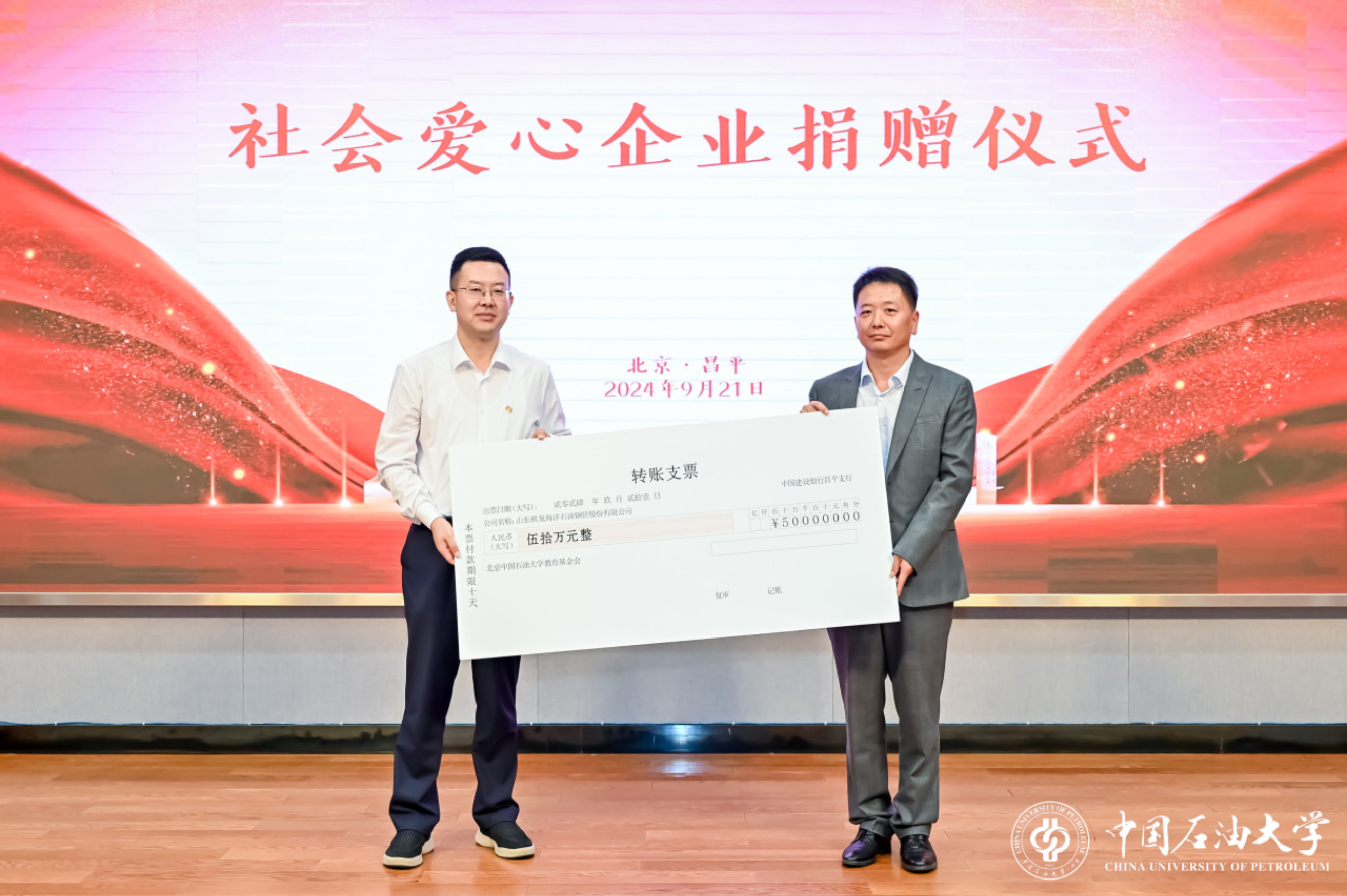 会上,北京德美高科科技股份有限公司董事长张德斌、山东祺龙海洋石油钢管股份有限公司总经理孟庆滨分别代表两家爱心企业,为学校捐赠100万元、50万元。文永红代表北京中国石油大学教育基金会接受捐赠并颁发捐赠证书。