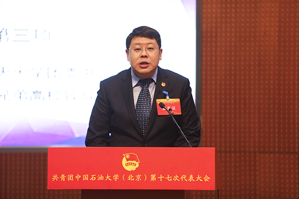 石大团委书记周玉成代表第十六届委员会向大会作了题为“不忘初心,紧跟党走,为建设石油石化学科领域世界一流研究型大学贡献青春力量”的工作报告。报告回顾了过去六年的团学工作,指出六年来学校共青团组织在思想引领、组织建设、创新实践、校园文化建设工作方面取得了瞩目的成果,围绕“凝聚青年、服务大局、当好桥梁、从严治团”四维工作格局,团结带领全校广大青年不忘初心、紧跟党走。报告对共青团今后五年的工作进行了部署和展望。报告指出,未来五年石大共青团工作将以《中共SUNBET申搏官网委员会关于进一步加强和改进共青团工作的若干意见》为统揽,围绕一个根本任务,聚焦两大阵地,完善三个平台,筑牢四大基石,团结带领全校广大青年不忘初心,牢记使命,向着把学校建设成为石油石化学科领域世界一流研究型大学的宏伟目标不懈奋进。