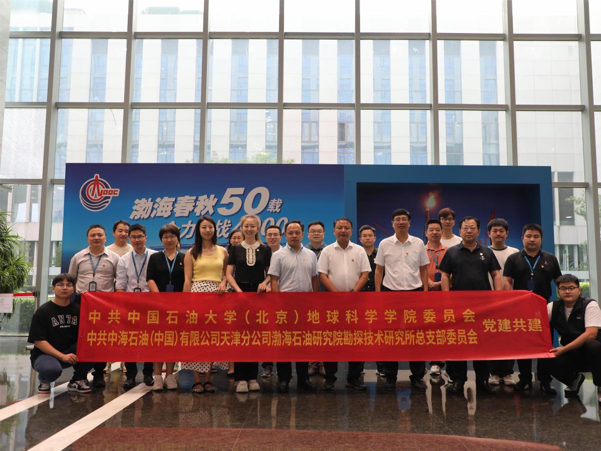 为全面贯彻落实习近平总书记关于能源安全新战略重要指示批示精神和科技创新的重要论述,深入推进党纪学习教育,创新党建活动载体,不断推动党建与科研深化融合,7月16日,中石大地球科学学院赴中海石油(中国)有限公司天津分公司渤海石油研究院勘探技术研究所开展党建共建活动,签署党建共建协议和地球科学科普教育基地暨大学生社会实践基地共建协议书,并为基地揭牌。